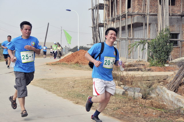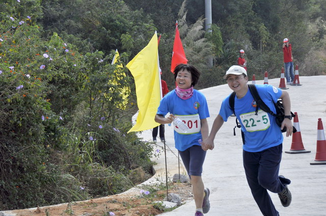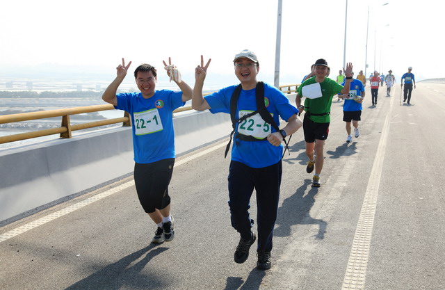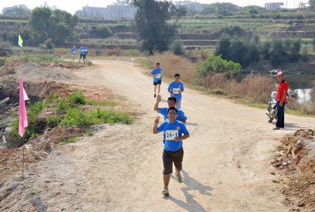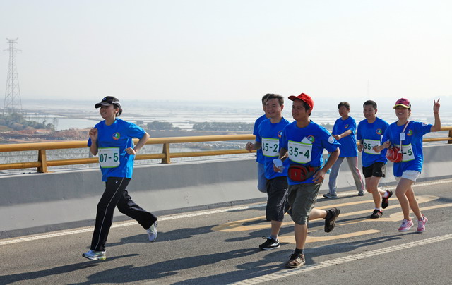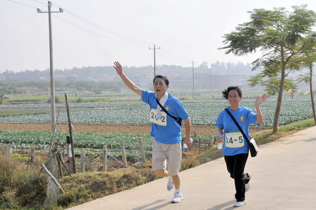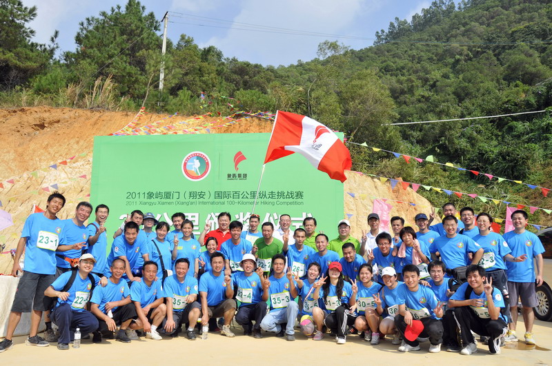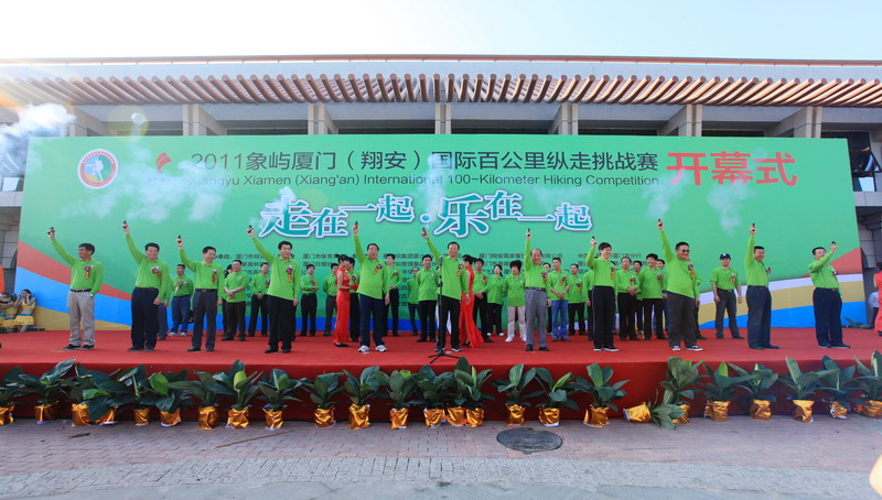 11月5日8時09分,明媚秋光里,廈門市委常委、副市長臧杰斌宣布2011象嶼廈門(翔安)國際百公里縱走挑戰(zhàn)賽開始,廈門市人大常委會副主任黃杰成、廈門市政協(xié)副主席陳昌生、國家奧林匹克體育中心副主任彭維勇、象嶼集團(tuán)總裁張水利等一起為比賽鳴槍。來自28個國家和地區(qū)的近萬名運(yùn)動愛好者,從大嶝小鎮(zhèn)·臺灣免稅公園廣場出發(fā),穿越田野、海濱、山巒、閩南古厝,開始了一段挑戰(zhàn)自我的征途。這其中,由象嶼集團(tuán)員工及家屬、合作伙伴、共建單位等組成的千人象嶼團(tuán)隊分外引人注目,浩浩蕩蕩的象嶼人走在一起、樂在一起,在欣賞沿途自然、人文風(fēng)光的同時,也享受著挑戰(zhàn)自我、永不止步的健康向上,享受著與同事、親朋共度美好秋假的怡然歡樂。