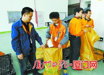 4、分類(lèi)打包——快遞員工將郵件進(jìn)行分類(lèi)打包。