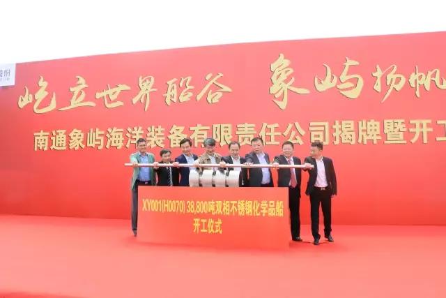 首制船“XY001”號38800噸不銹鋼化學(xué)品船同期開工。江蘇省經(jīng)信委副主任、國防科工委主任秦雁,南通市委常委、通州區(qū)委書記宋樂偉,南通市副市長徐新民,通州區(qū)區(qū)委副書記、區(qū)長陳永紅,華融航運(yùn)金融租賃有限公司總經(jīng)理樊旭平,象嶼集團(tuán)總裁陳方,中海重工董事局主席李明,南通象嶼副董事長朱建華,共同推動38800噸不銹鋼化學(xué)品船開工桿!