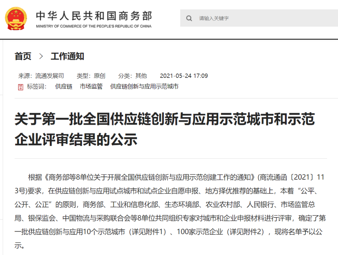 商務部此次公示的“全國供應鏈創(chuàng)新與應用示范城市和示范企業(yè)評審結果”,是商務部、工業(yè)和信息化部、生態(tài)環(huán)境部、農業(yè)農村部、人民銀行、市場監(jiān)管總局、銀保監(jiān)會、中國物流與采購聯(lián)合會等8單位共同組織專家對城市和企業(yè)申報材料進行評審確定的結果。